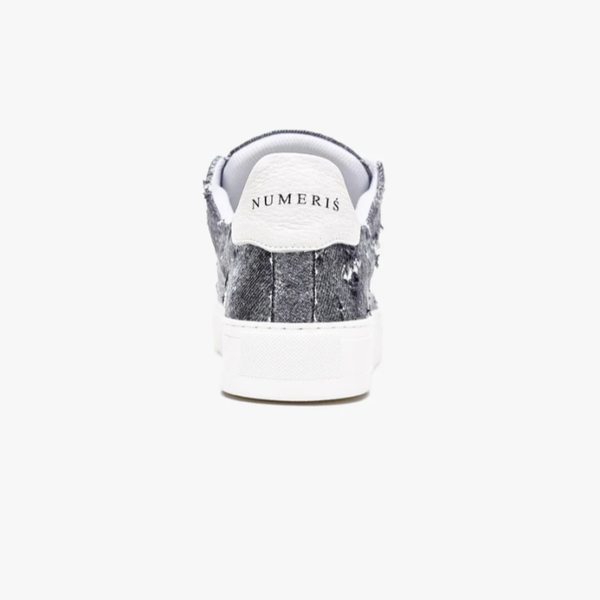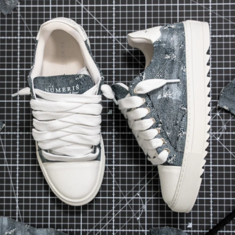 The Thrashed Denim trainer is a celebration of freedom and self-expression. Crafted with meticulous attention to detail, its bespoke hand-distressed washed denim upper is the result of an extensive development process. It took time to perfect the ideal wash, carefully refining techniques to achieve the signature "thrashed" look—ensuring a balance of character and wearability. This dedication to detail means no two pairs will ever bear the same distressed pattern, making each one a unique work of art. Complementing this distinctive feature is the signature crisp white pebbled leather toe cap, adding a touch of sophistication to the design. Inside, the trainer boasts a comfortable collar lining that enhances the overall wear experience. The finishing touches include our distinctive Numeriś branding on the heel, accompanied by the style-defining slogan, 'Design is thinking made visual.”